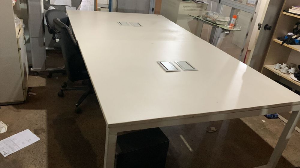 Mesa de podcast / mesa de reunião grande com passa-cabos